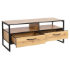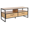 Тумба разместит телевизор и прочую технику, а функциональные секции обеспечат порядок в комнате. Текстура дерева в отделке придает обстановке уют и гостеприимность, а высокие металлические опоры упрощают уборку.