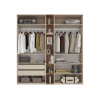 Шкафы позволяют организовать полноценную систему хранения всех предметов гардероба. Центральная часть представлена открытым стеллажом, где можно разместить декоративные элементы, книги или фотографии. Внутри пространство поделено на симметричные секции, каждая из которых предназначена для удобного распределения одежды и аксессуаров. Гладкие матовые фасады с изящными вертикальными ручками привлекательно смотрятся в современном интерьере.