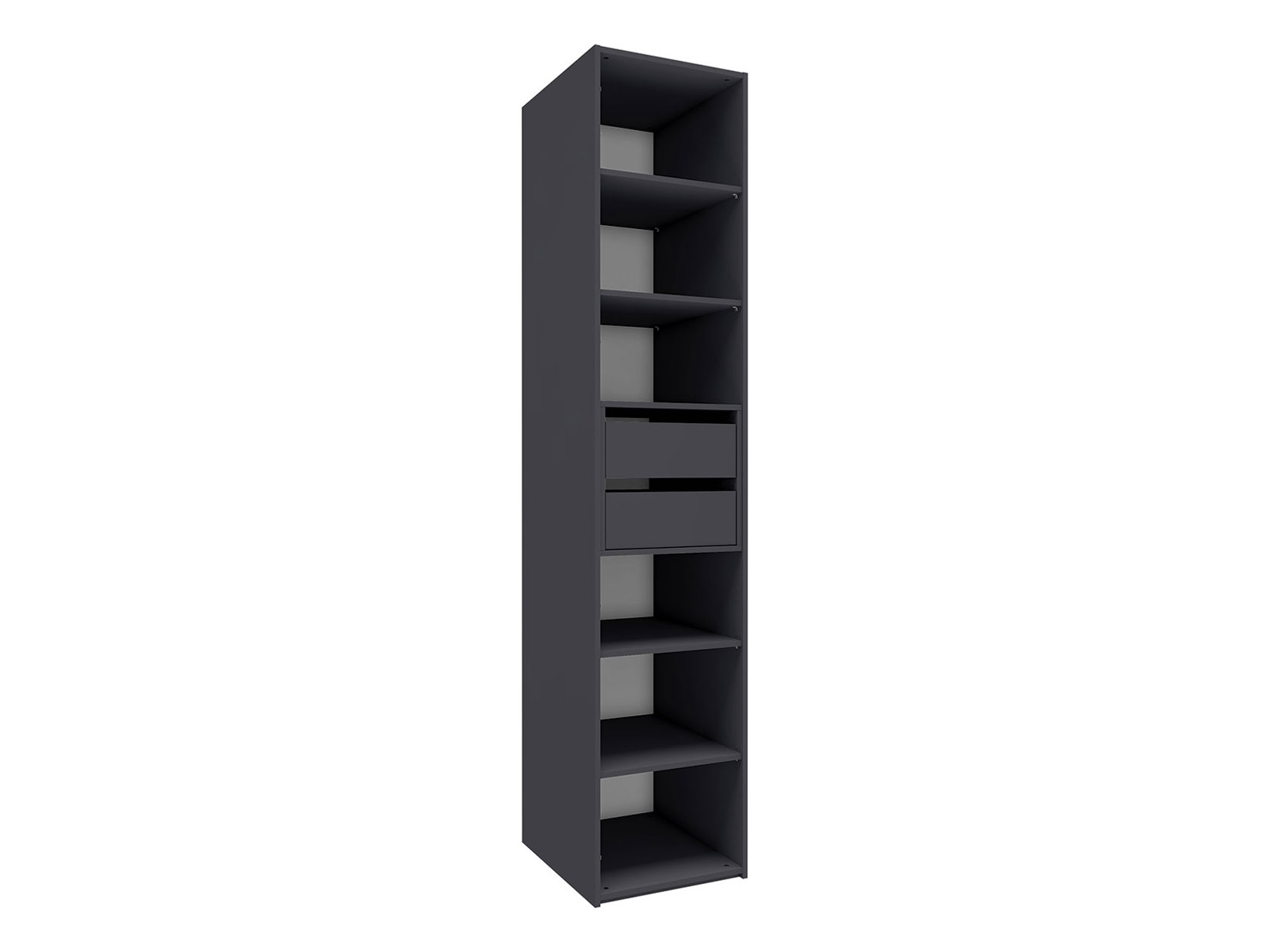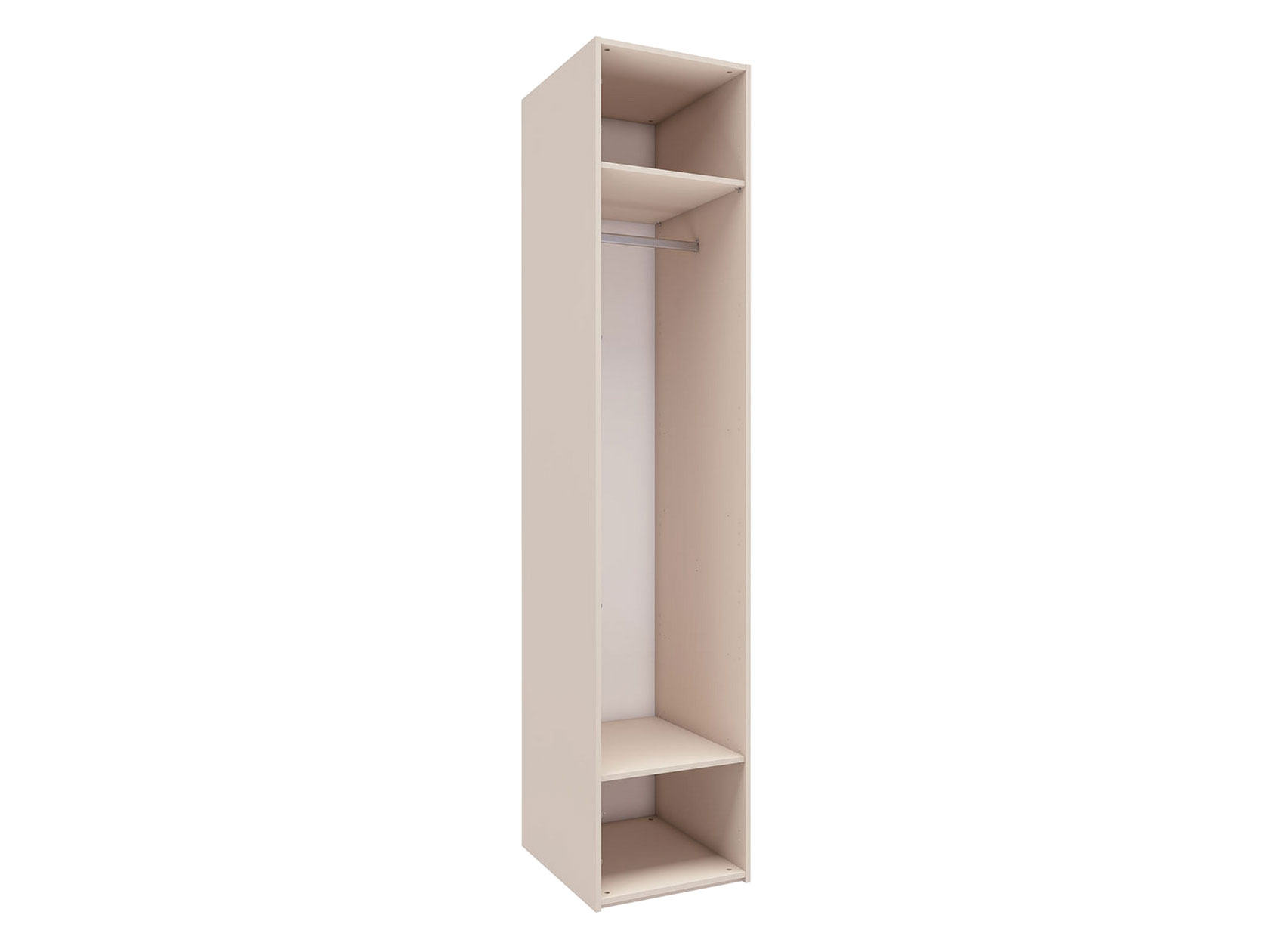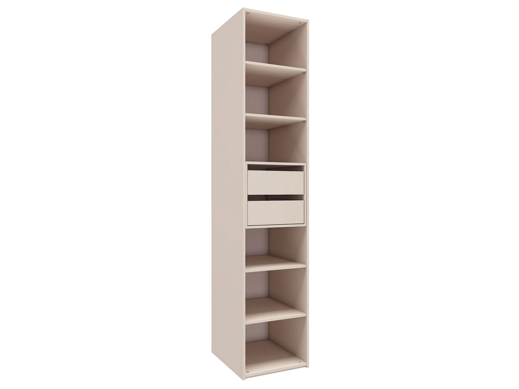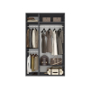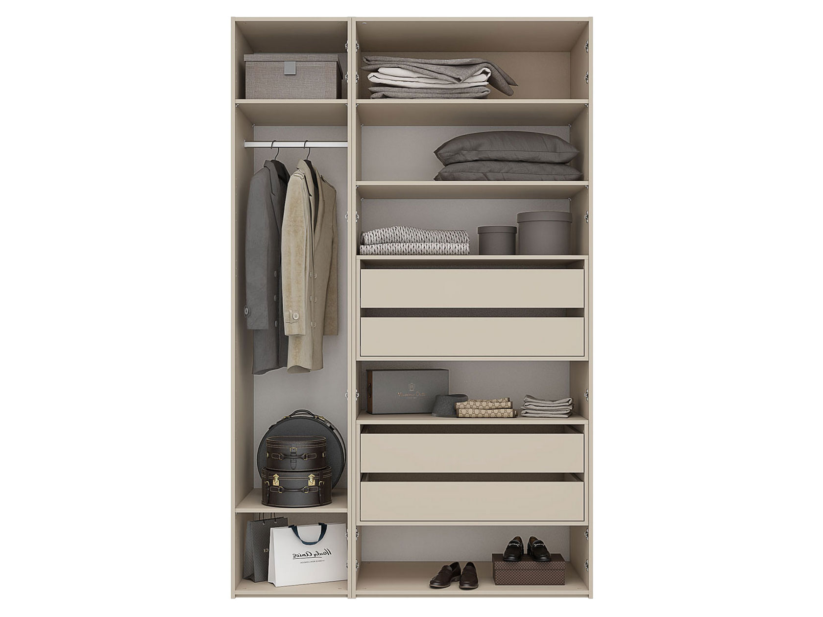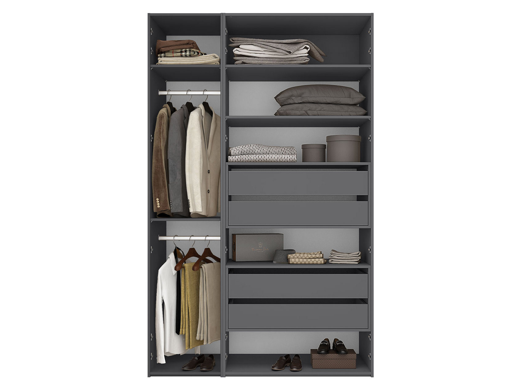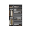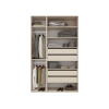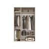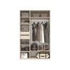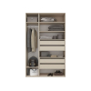 Просторная секция со штангой обеспечит место для одежды на вешалках. Удобные полки и выдвижные ящики идеально подходят для коробок, обуви, аксессуаров и различных мелочей. Лаконичные фасады украшены тонкими вертикальными ручками, что придает современный и элегантный облик. Зеркальная вставка по центру визуально увеличит пространство и добавит комфорта при выборе наряда на день.