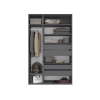 Просторная секция со штангой обеспечит место для одежды на вешалках. Удобные полки и выдвижные ящики идеально подходят для коробок, обуви, аксессуаров и различных мелочей. Лаконичные фасады украшены тонкими вертикальными ручками, что придает современный и элегантный облик. Зеркальная вставка по центру визуально увеличит пространство и добавит комфорта при выборе наряда на день.