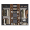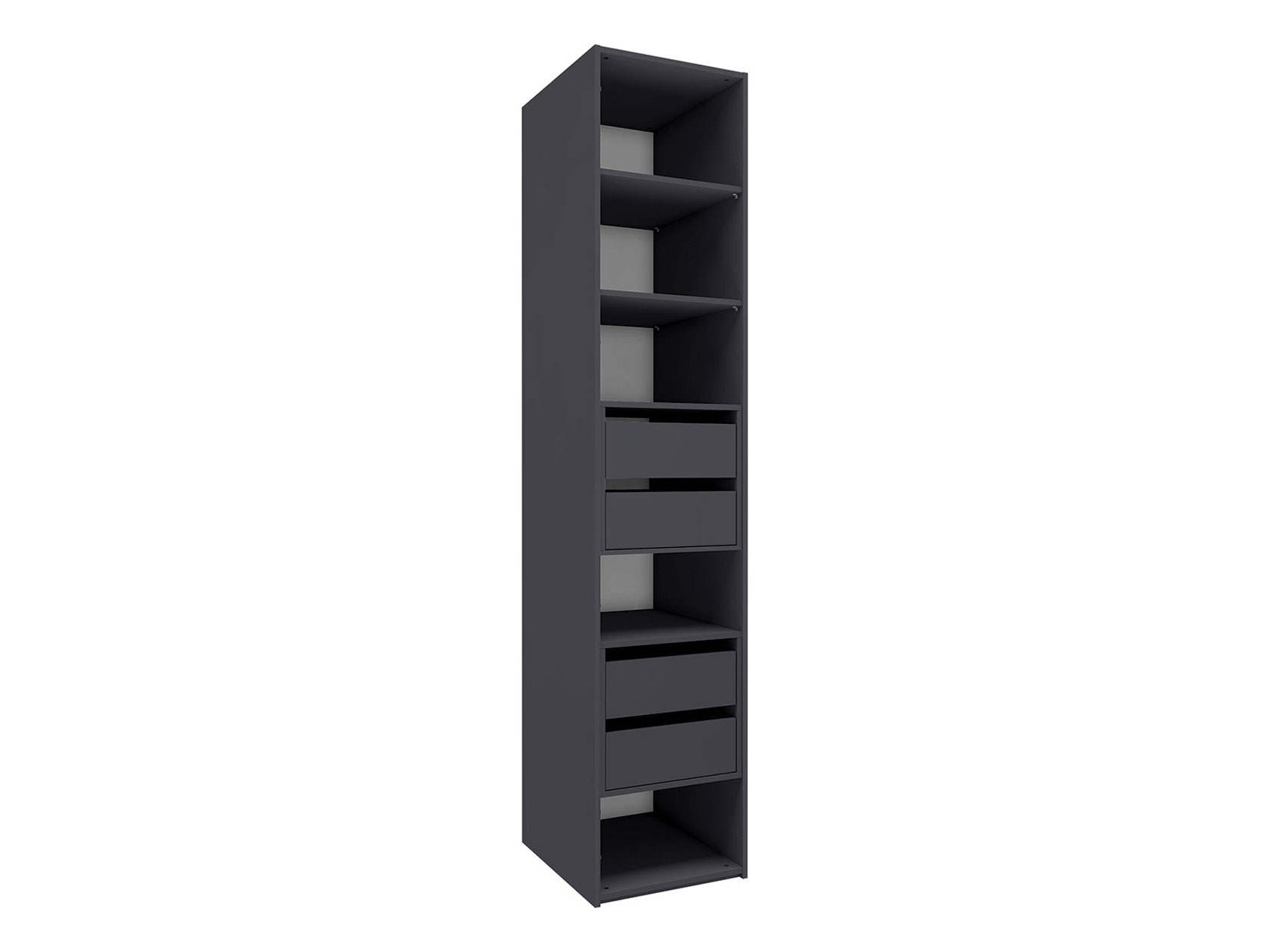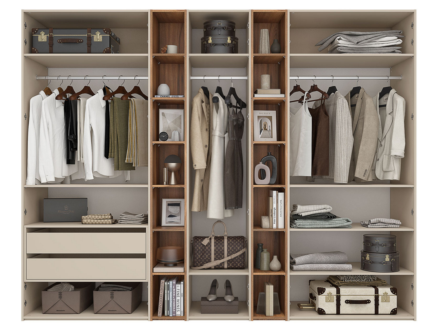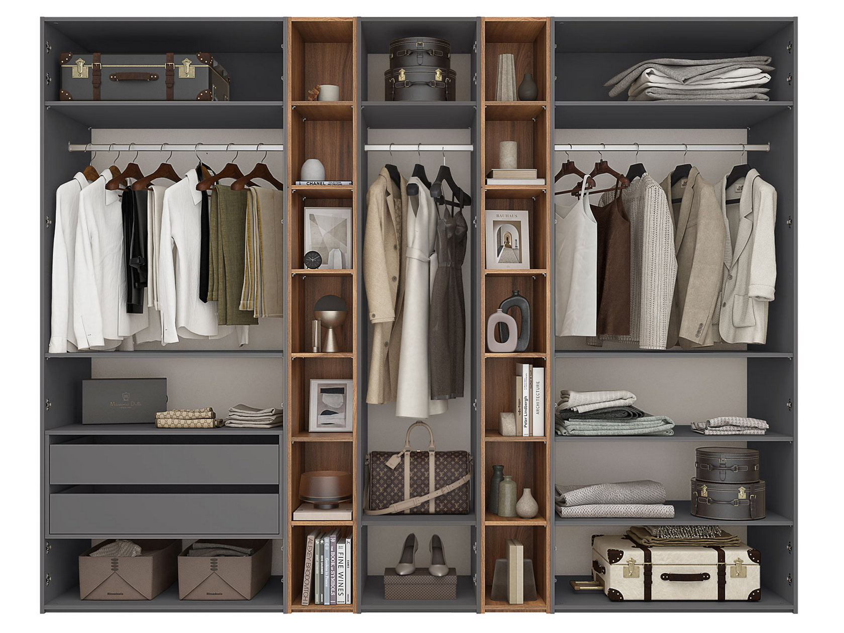 Длинные штанги, просторные полки, выдвижные ящики и открытые ниши позволяют удобно хранить одежду, обувь, аксессуары и декоративные элементы. Вместительная конструкция дает возможность распределить все вещи по категориям. Элегантный дизайн без лишних деталей удачно интегрируется в любой современный интерьер.