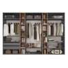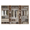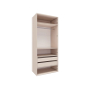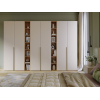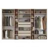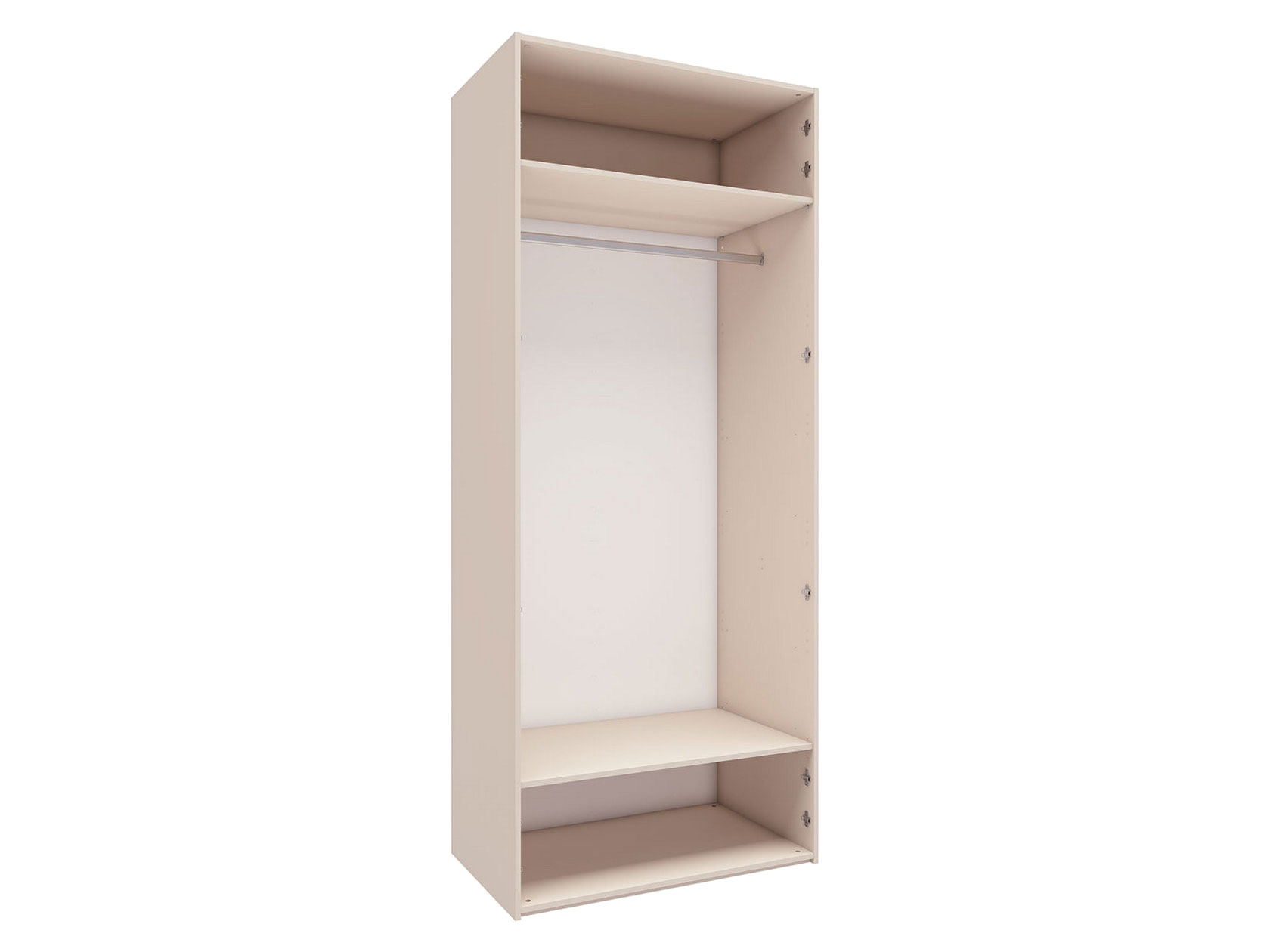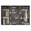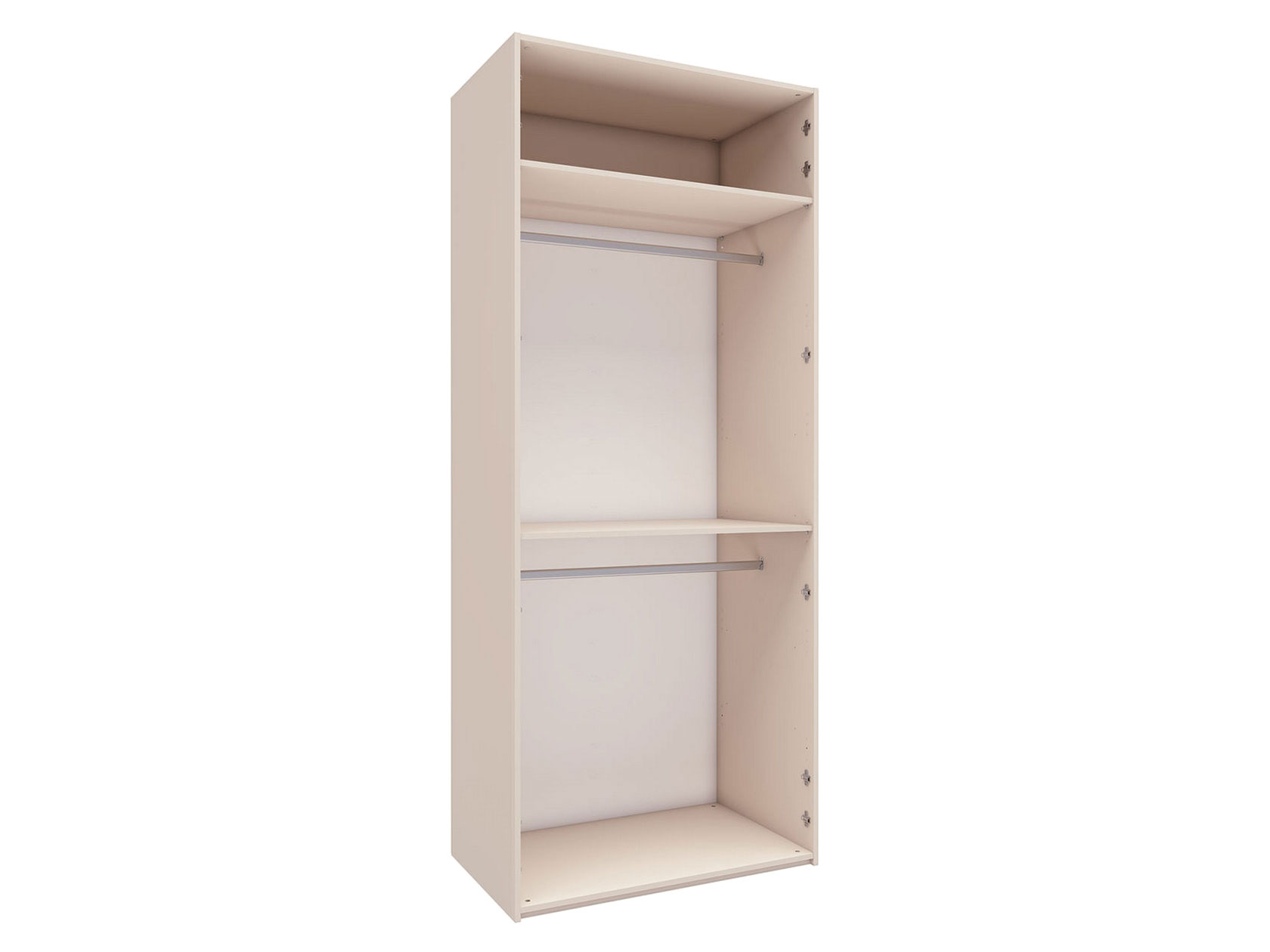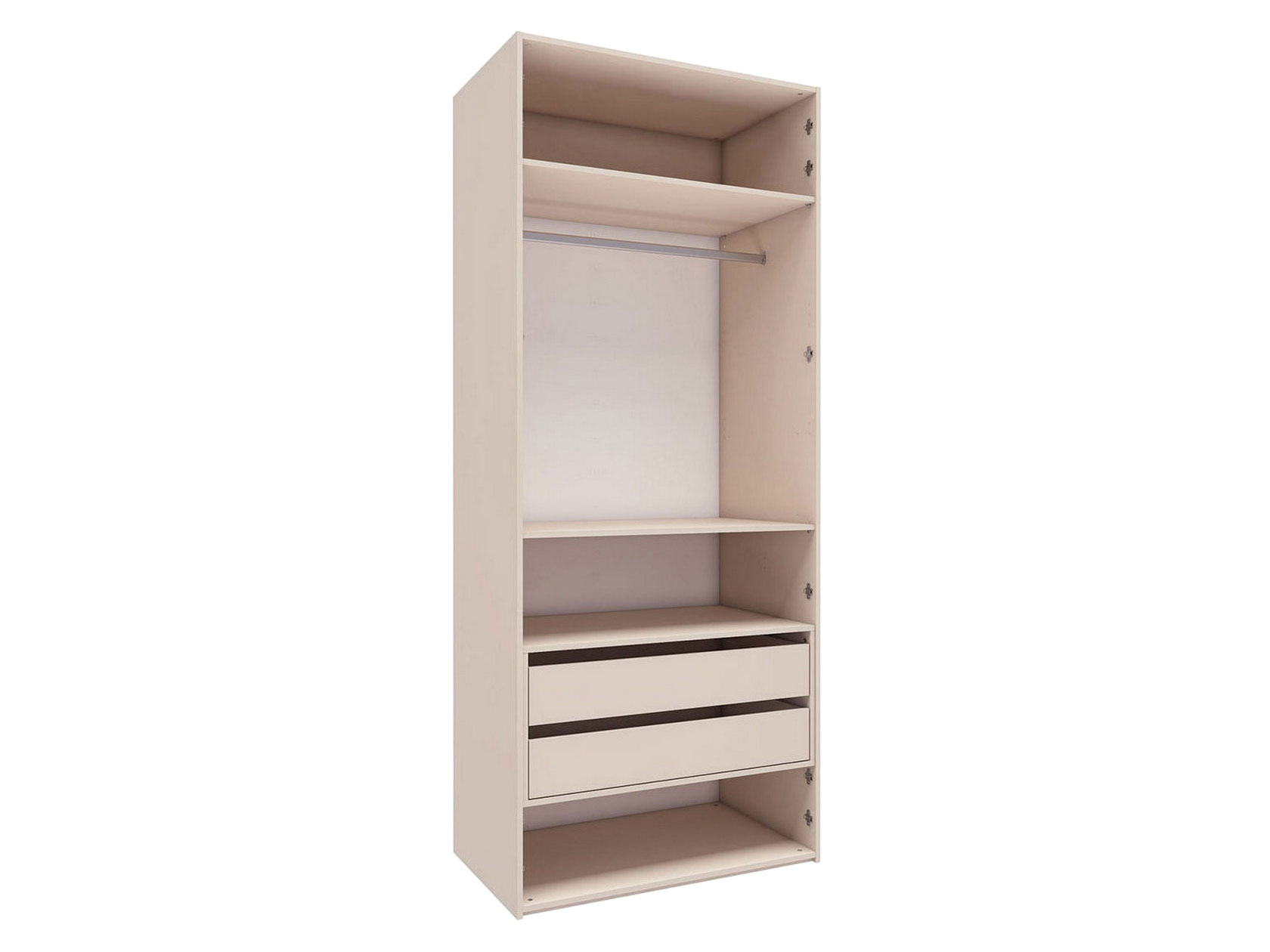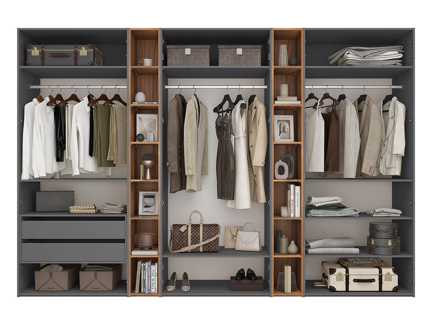 Светлые матовые фасады с вытянутыми ручками создают современный и лаконичный дизайн, а открытые секции со вставками под дерево добавляют интерьеру теплоту и уют. Длинные штанги, просторные полки, выдвижные ящики и открытые ниши позволяют удобно хранить всё: от одежды и обуви до аксессуаров и декора.