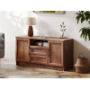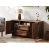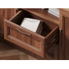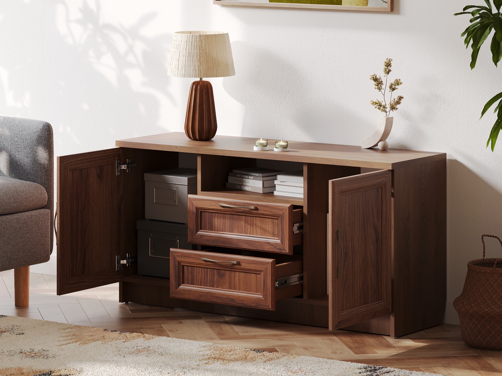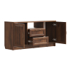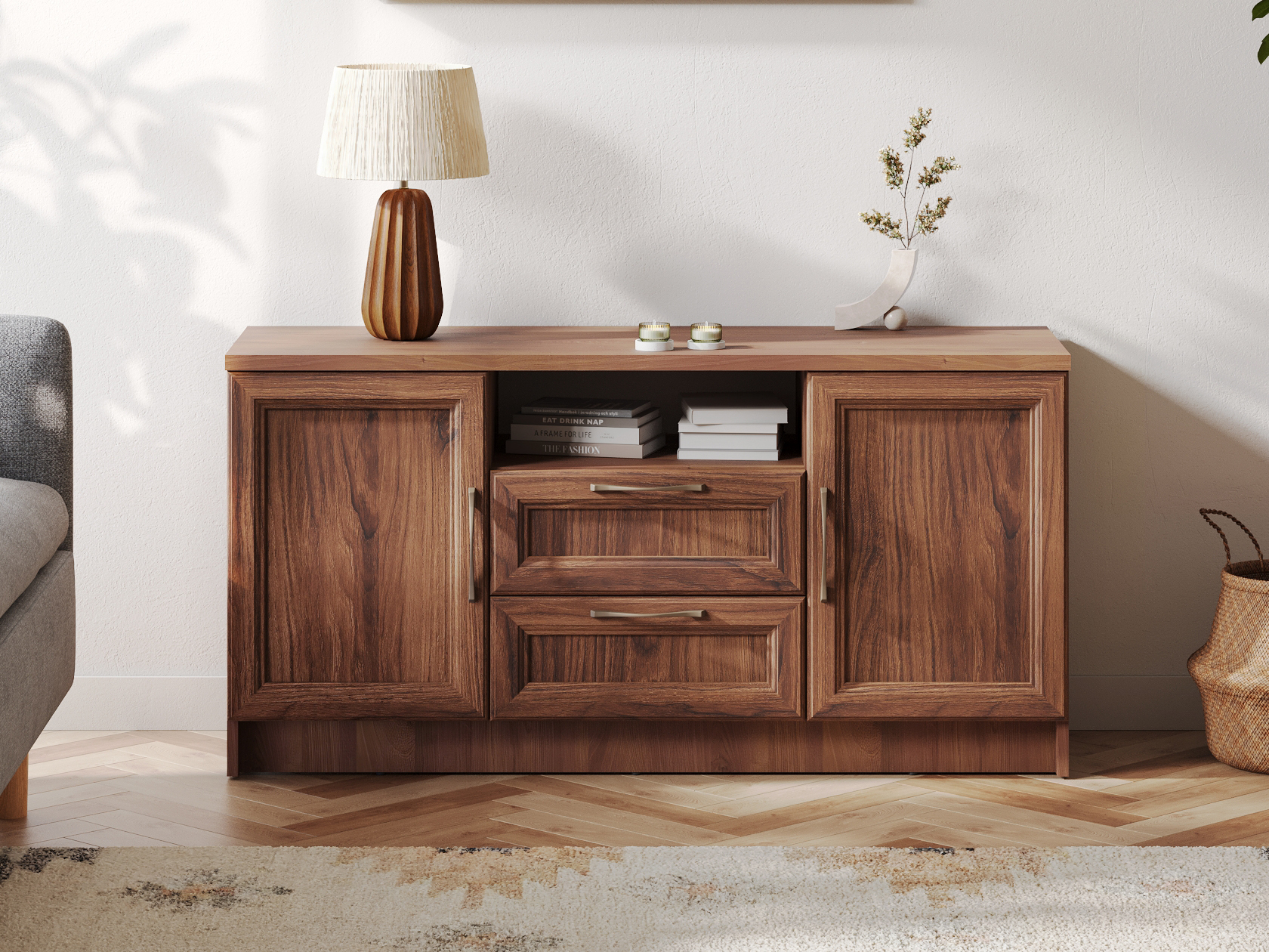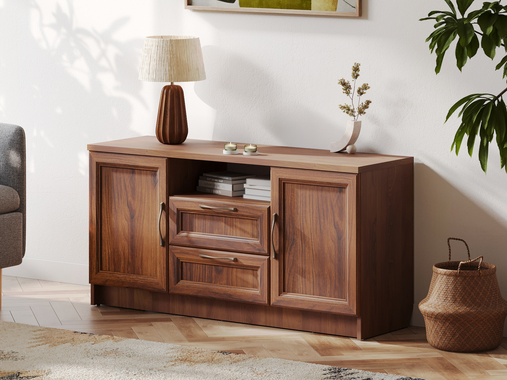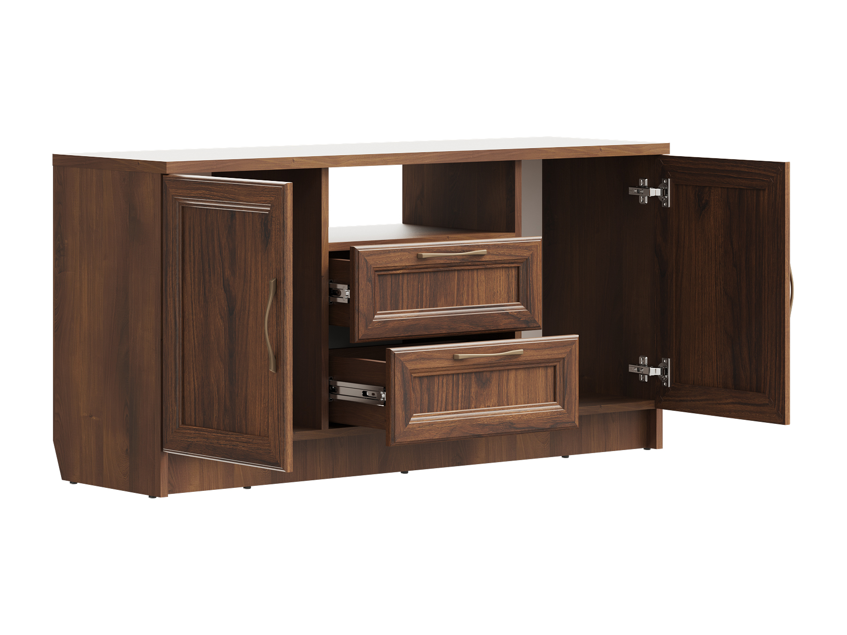 Открытая ниша позволит держать на виду пульты и прочие полезные мелочи. Выдвижные ящики идеальны для хранения зарядных устройств и гаджетов. За распашными дверцами удобно хранить личные вещи и печатную продукцию. Фасады декорированы рамками с изящными металлическими ручками, что придает мебели элегантный облик.