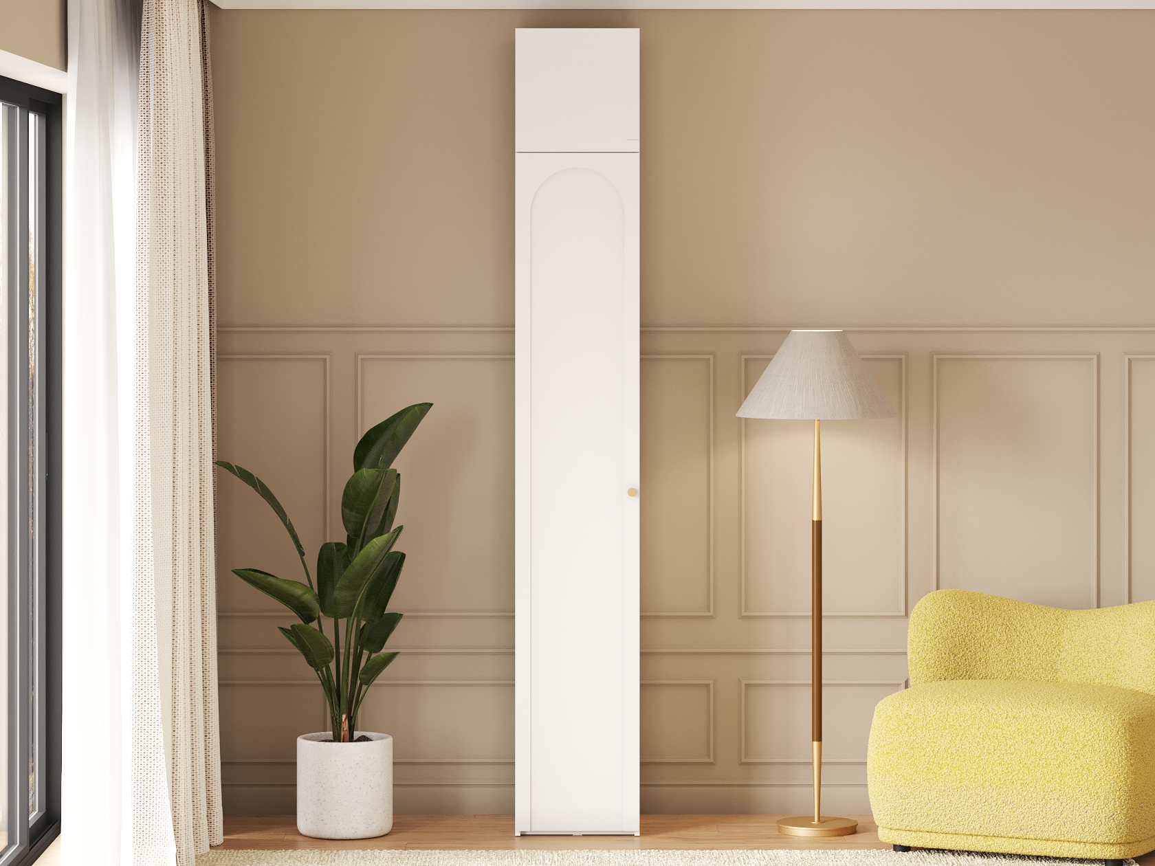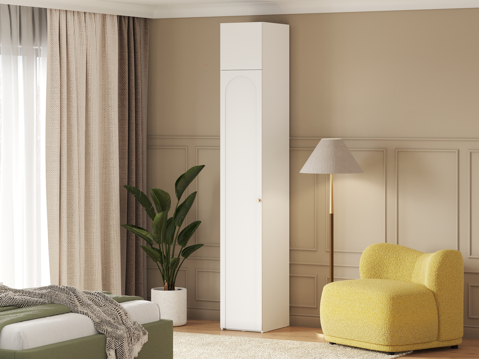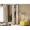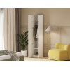 Внутреннее пространство организовано антресольной и нижней полками, а также продольной штангой, что позволяет удобно разместить одежду, аксессуары и другие предметы. Матовый фасад с изящной арочной фрезеровкой подчеркивает элегантность дизайна.